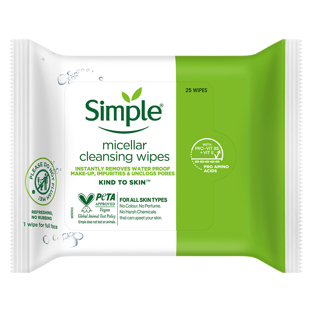 # Simple Kind To Skin Micellar Cleansing Wipes, gently removes make up, dirt and impurities, even waterproof mascara Enriched with Vitamin B5, E a...